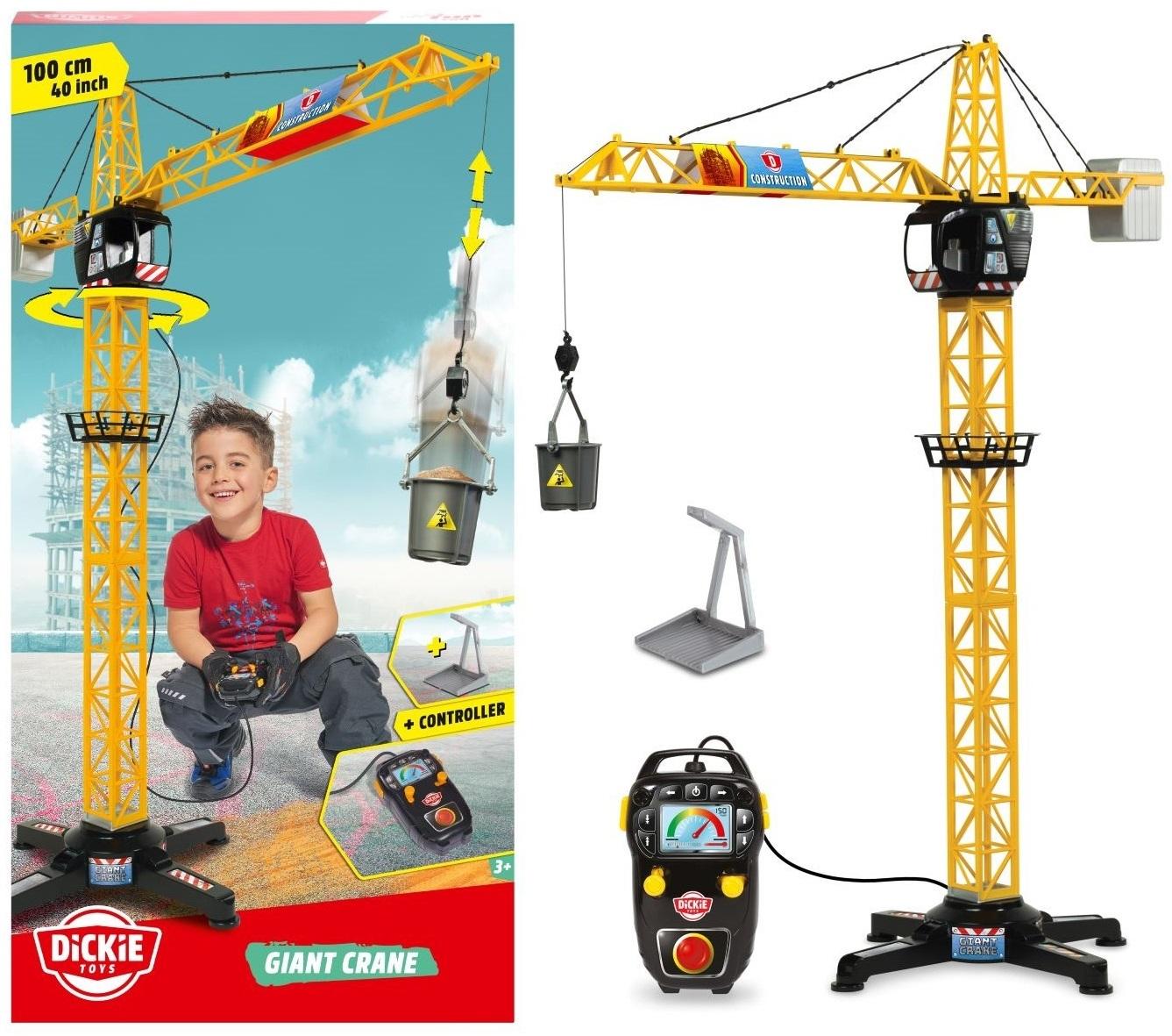 *Giant Crane Toy Set – Height-adjustable crane (up to 100 cm) with cable remote control, light and sound*Made from high-quality plastic, the Dickie Toys Giant Crane is 100 cm tall and makes a real eye-catcher in any children’s bedroom. Thanks to the colorful design that looks just like a real crane, this toy is guaranteed to stimulate your little one’s imagination and provide hours of endless fun! The toy also comes with a controller (requires 4× 1.5 V AA batteries, not included), which you can use to control the crane and transport heavy loads with ease from A to B.Thanks to the intuitive layout, your little one will get to grips with the controls in no time. What’s more, the crane also comes with a container that can be attached via a hook and loaded with different objects, such as marbles or toy sand. In addition to training hand-eye coordination, the controller features a wired design to prevent it from getting lost. The crane can also rotate up to 360 degrees, allowing your little one to reach objects on all sides.*Features:** Height-adjustable crane (up to 100cm).* With cable remote control, light and sound.* Rotating cabin and trolley.*4 x AA Batteries Required (Not Included)**Suitable for ages 3 & up*