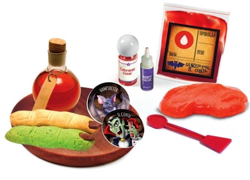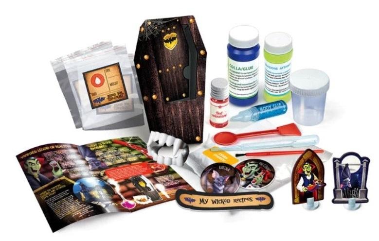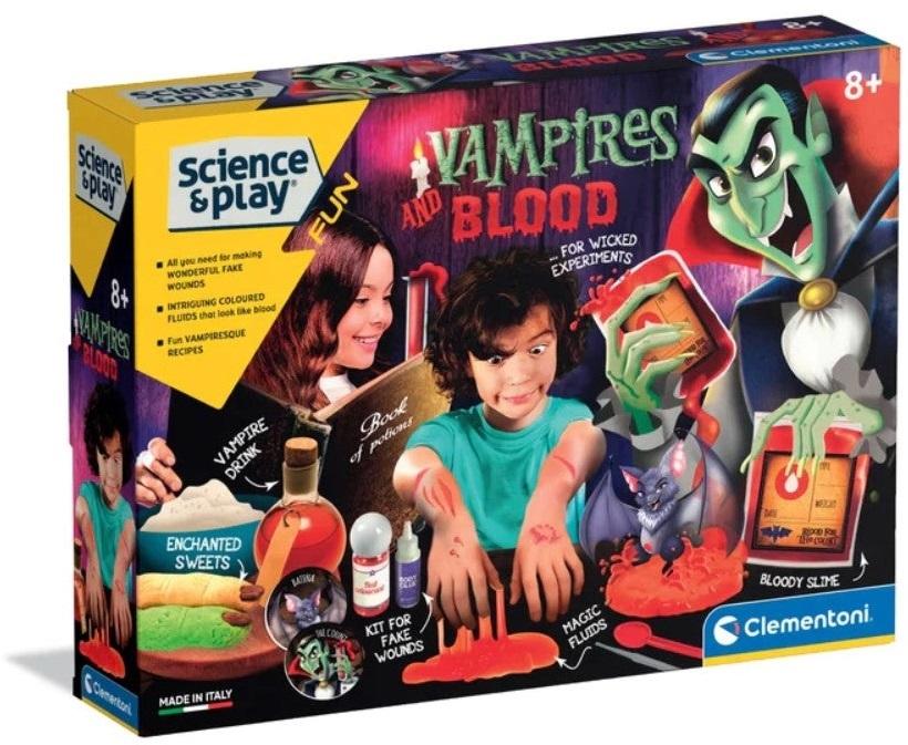 *Clementoni: Vampires and Blood Kit*A scientific laboratory that is a scream – for children to create “vampirish” howlingly funny and blood-curdling slimes! The kit contains all they will need to create wounds and fake blood to be poured into sachets for transfusions as well as a frightful set of false teeth for gripping fun in the world of vampires! Children will enjoy themselves experimenting with the science of horror, learning the principles of chemistry in a fun way and creating lots of different spooky vampirish slimes! The manual will guide children as they carry out the experiments in total safety and suggest extra experiments, such as making a vampire drink to be enjoyed with witches’ fingers. All the component parts and ingredients of this game have been tested to ensure plenty of engaging fun in complete safety for children. Conceived, designed and developed in Italy.*Features:** All you need for making wonderful fake wounds* Intriguing coloured fluids that look like blood* Fun vampirescque recipes*For Ages 8 and up*