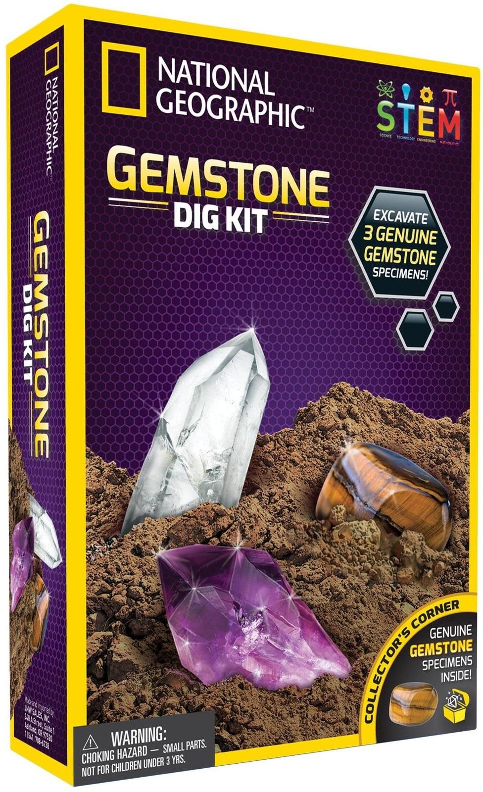 *Dig Up Precious Stones and Start an Amazing Rock Collection!*National Geographic’s Gemstone Dig is an exciting hands-on adventure that kids absolutely love! Your child will become a treasure hunter as they carefully uncover spectacular gemstones using the digging tools provided. National Geographic’s full-color learning guide makes identifying each specimen easy. The guide is also packed full of information and amazing facts about their crystals.This science kit includes: One digging brick containing 3 amazing gemstones (quartz, amethyst, and tiger’s eye), archeological digging tools, full-color learning guide, and magnifying glass.