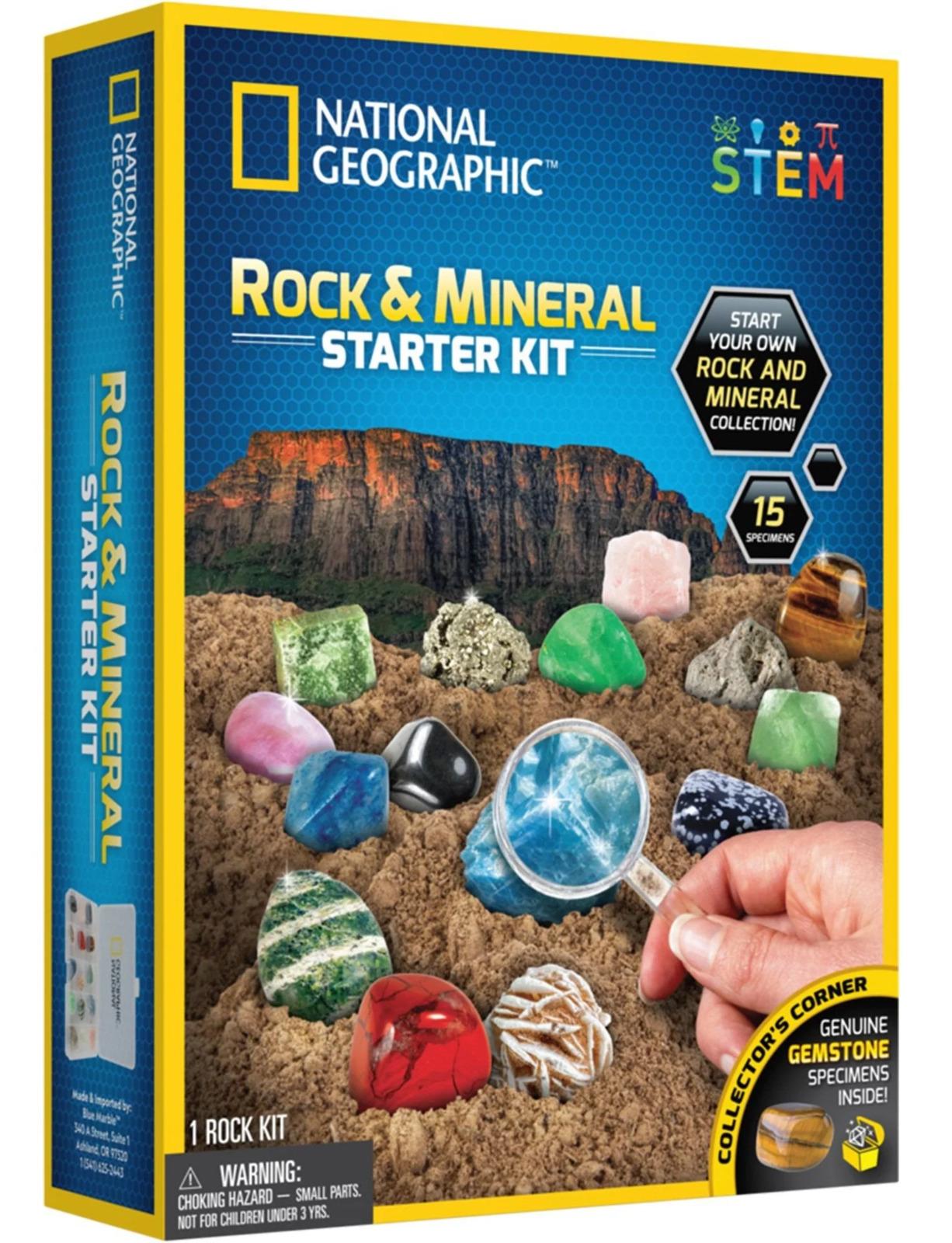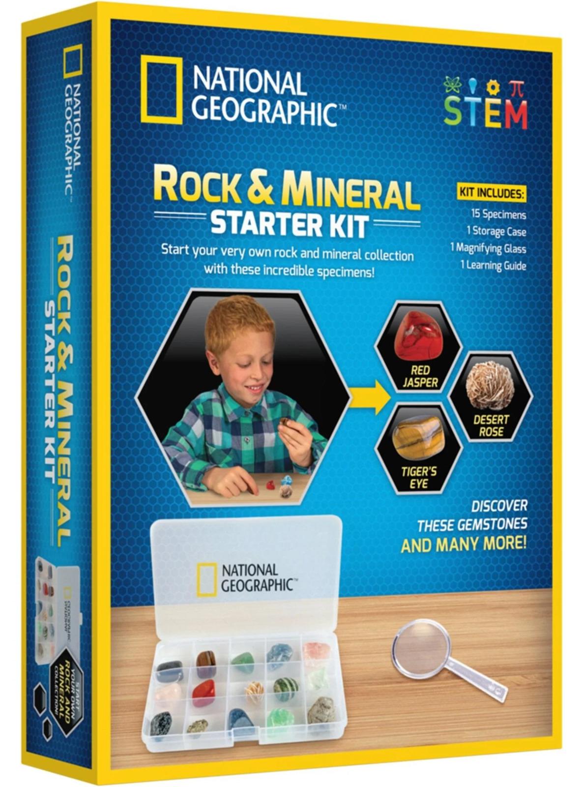 *The National Geographic Rock and Mineral Starter Kit contains 15 incredible specimens that are sure to inspire a fascination with geology and the earth sciences.*Inside you get hematite, two samples of rose quartz, snowflake obsidian, tiger's eye, red jasper, two samples of green aventurine, green zebra jasper, desert rose, pumice, pyrite, blue quartz, blue calcite, and fluorite. There's also a magnifying glass to inspect the rocks, gemstones, and crystals with and a clear storage and display case.This rock collection includes Rose Quartz, Red Jasper, Tiger’s Eye, Aventurine, Snowflake Obsidian, Pyrite, Desert Rose, Blue Quartz, Pumice, Hematite, Blue Calcite, Green Zebra Jasper and Fluorite. Please note – The size and appearance of rocks may vary.*Features:** Rock Collection for Kids: 15 incredible rocks, gemstones, and crystals* Great starter set for boys and girls with an interest in Geology* A full-colour learning guide has information on each specimen in the set* Along with a magnifying glass inside allows you to see more details of each stone* The included acrylic case has a separate compartment for each specimen.* It seals securely and allows you to see all the samples inside* Our samples are selected to inspire a fascination with earth science* Encourage exploration of the natural world*Suitable for ages 8 & up*