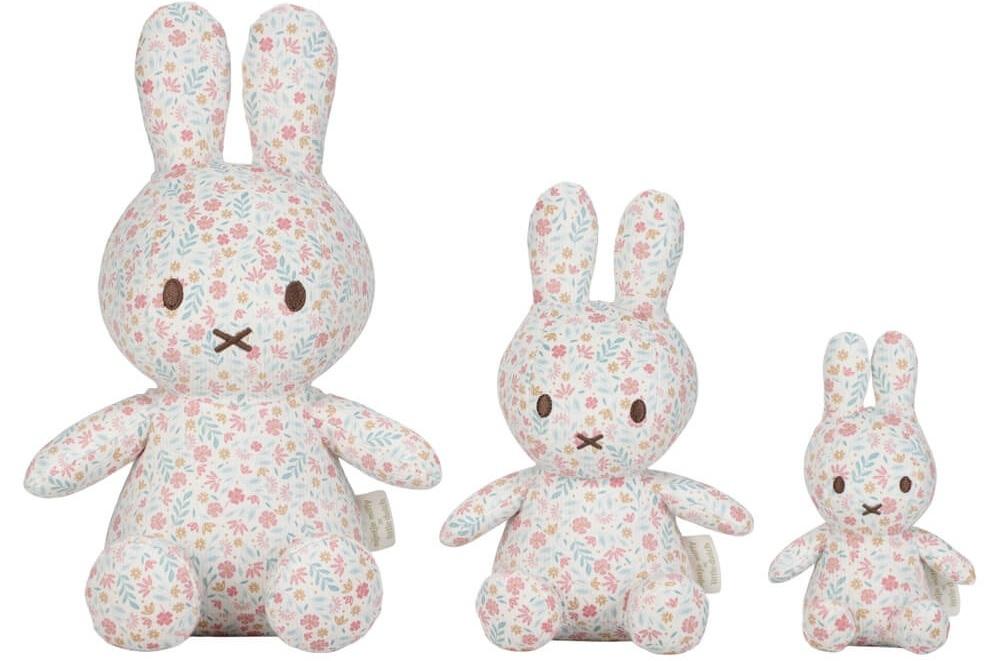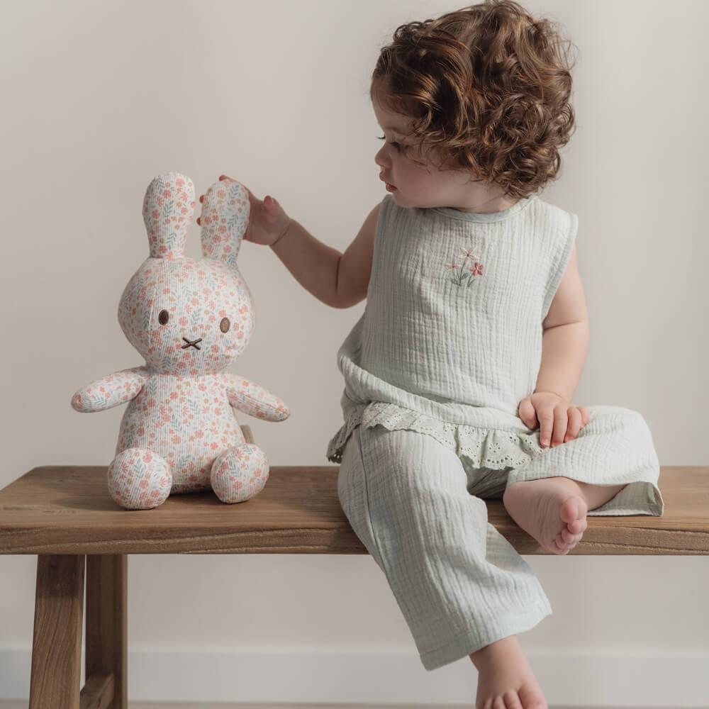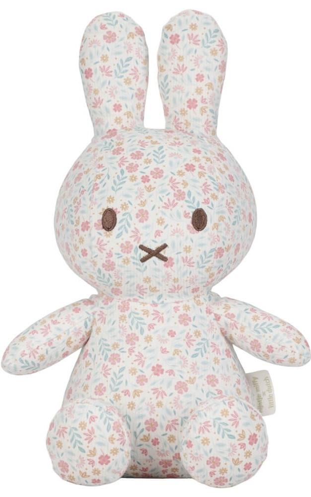 Cuddle Miffy and discover her new outfit! This sweet 30cm bunny is fully covered in the beautiful Lucky Blossom print designed by Little Dutch. She is made of soft plush and printed corduroy, perfect for cuddling while playing, on the go, or at bedtime. There is a playful bell in the cuddly toy. A wonderful addition to the baby room and friend for your little one!*Features:** Miffy x Little Dutch collaboration* Lucky Blossom pattern* Great for the nursery* Soft plush* Suitable from birth