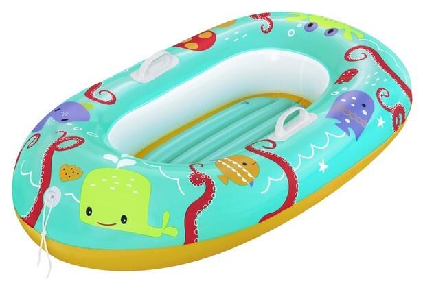 *Bestway: Tropical Crew Baby Boat*If your child enjoys spending time in the water or is just getting used to the water, equip them with a float. The pontoon is light and handy, after folding it does not take up much space, so it can be easily transported. Interesting graphics will also encourage your child to play in the water. The inflatable boat is intended for children aged 3 to 6 years. The inflatable floor and handles keep your child comfortable.*Features:** Made of durable PVC* Ages 3–6 years* Colorful sea creature design* Inflatable floor for extra comfort* Heavy-duty grab handles* Safety valves* Including repair patches* Color box* Dimensions 119 cm x 79 cm*Suitable for Ages 3+*_Due to their lightweight nature, inflatable devices designed for home use may pose a serious risk of injury if not used properly or in bad weather conditions._*Children, especially children under five years, are at high risk of drowning.**Constant parental supervision is required at all times.*