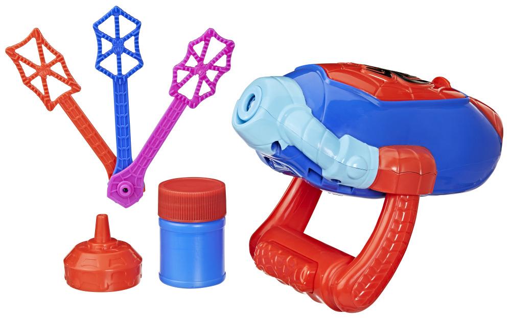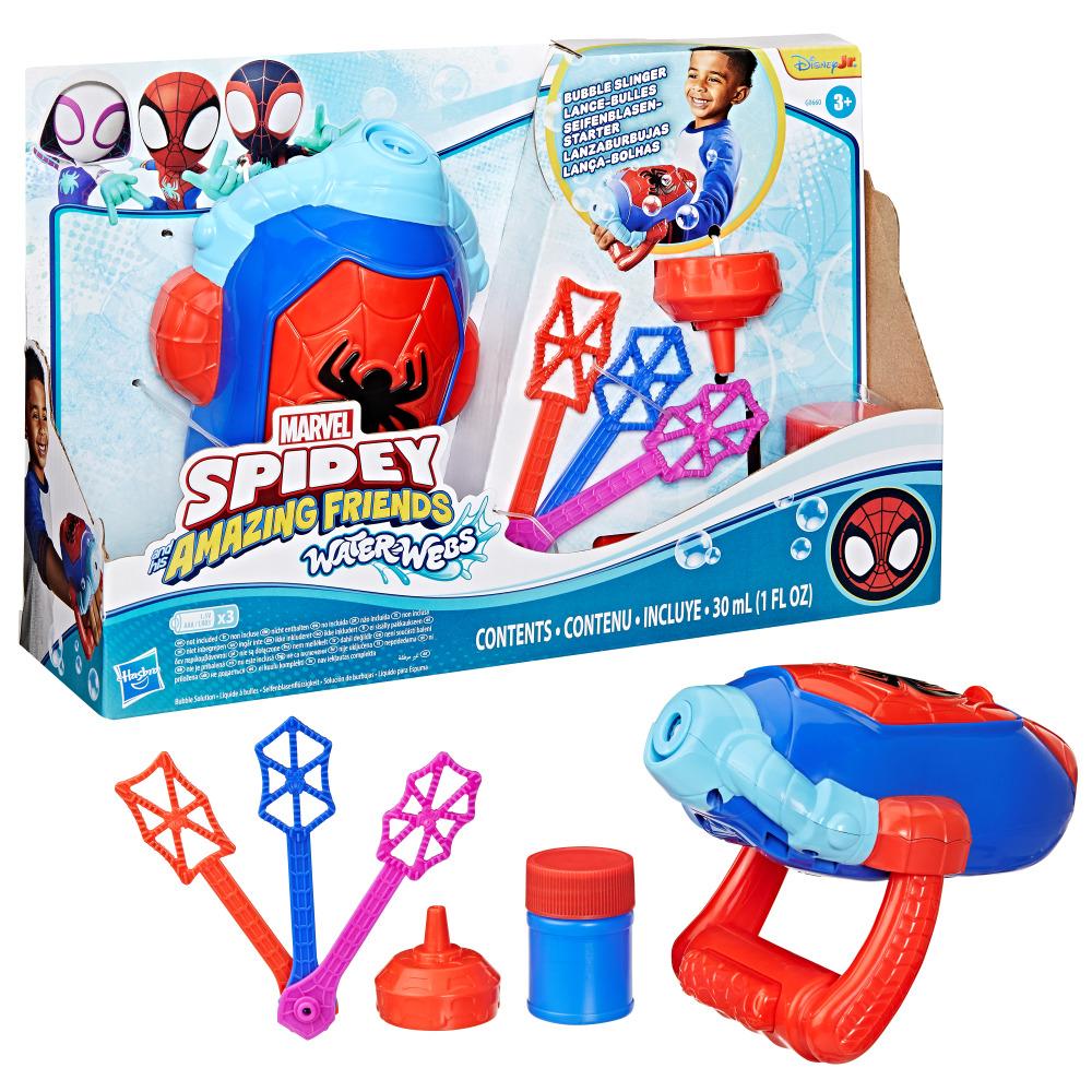 *Spidey and His Amazing Friends: Spidey Bubble Slinger*Imagine swinging in to save the day with this Marvel Spidey and His Amazing Friends Bubble Slinger! Kids ages 3 and up can suit up as Spidey and pretend to save the day with the electronic bubble blower. Fill the bubble maker toy with the included solution, then squeeze the handle to press the button and blast a stream of bubbles! Also includes three stackable bubble wands with design and deco inspired by the series on Disney Jr. Also comes with 1 bottle of bubble solution and 1 funnel for fast reload.Look for more Marvel Super Hero toys for boys and girls to collect, give as gifts, including water toys for kids, bubble toys, toy vehicles, and figures & playsets! Spidey toys make cool Marvel gifts for preschool kids! (Each sold separately. Subject to availability.)*Features:** Imagine slinging webs with this Spidey and His Amazing Friends Bubble Slinger electronic bubble toy* Kids will love pretending to blast the bad guys with this Marvel Bubble Slinger – just fill the bubble toy with the included solution and squeeze the handle to unleash a stream of bubbles* This Marvel Spider-Man toy includes 1 bottle of bubble solution and 1 refill funnel for quick reload that lets kids get back to pretending to be a web slinger with this awesome bubble blower* The electronic bubble maker comes with 3 stackable bubble wands kids can dip into the bubble solution, then blow their own bubbles* Kids can imagine slinging webs with this Marvel bubble blaster and imagine their own action-packed, web-slinging adventures* Look for more Spidey and His Amazing Friends toys to build an amazing Spider-Man web slinger collection* Look for more Marvel preschool Spider-Man toys for kids, including water toys, cool action figures, and action figure vehicles & playsets (Each sold separately. Subject to availability.)*Suitable for Ages 3+*