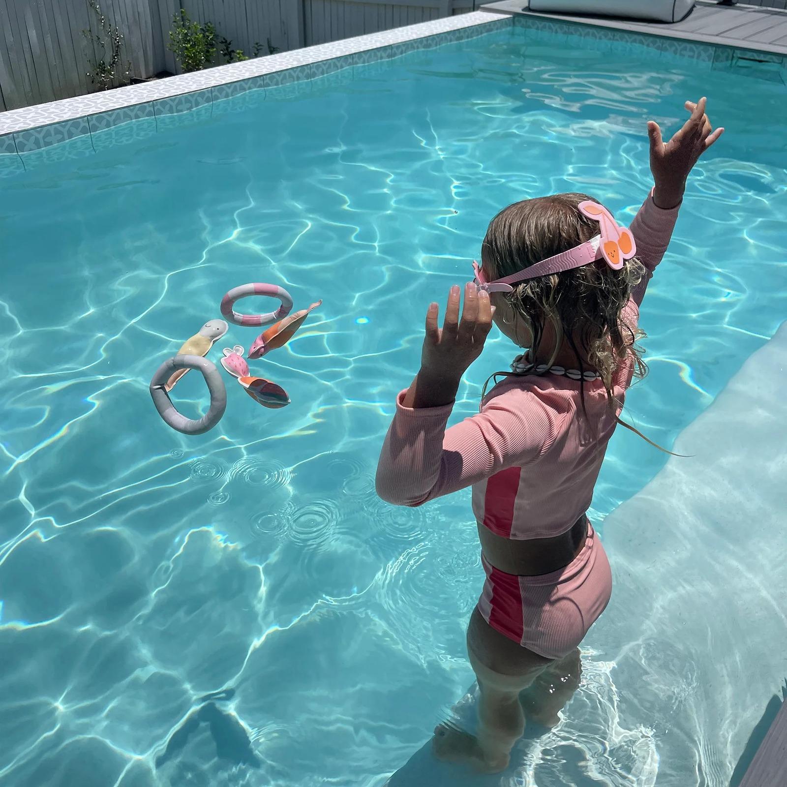 Dive into summer, SUNNYLiFE Dive Buddies are made for water play and skill development. Boost water confidence, make a splash, and experience the best of summer with summer's cutest accessory.*Features:** Set of 6.* Made from sustainable natural rubber.* Develops children's diving skills.*Specifications:** Product Dimensions: L 36 W 35 H 3 cm | L 14.17 W 13.78 H 1.18 in* Package Dimensions: L 44 W 30.7 H 5.2 cm | L 17.32 W 12.09 H 2.05 in* Package Weight: 1.37 kg | 3.02 lbs* Materials: Natural Rubber, Sand, Polyester