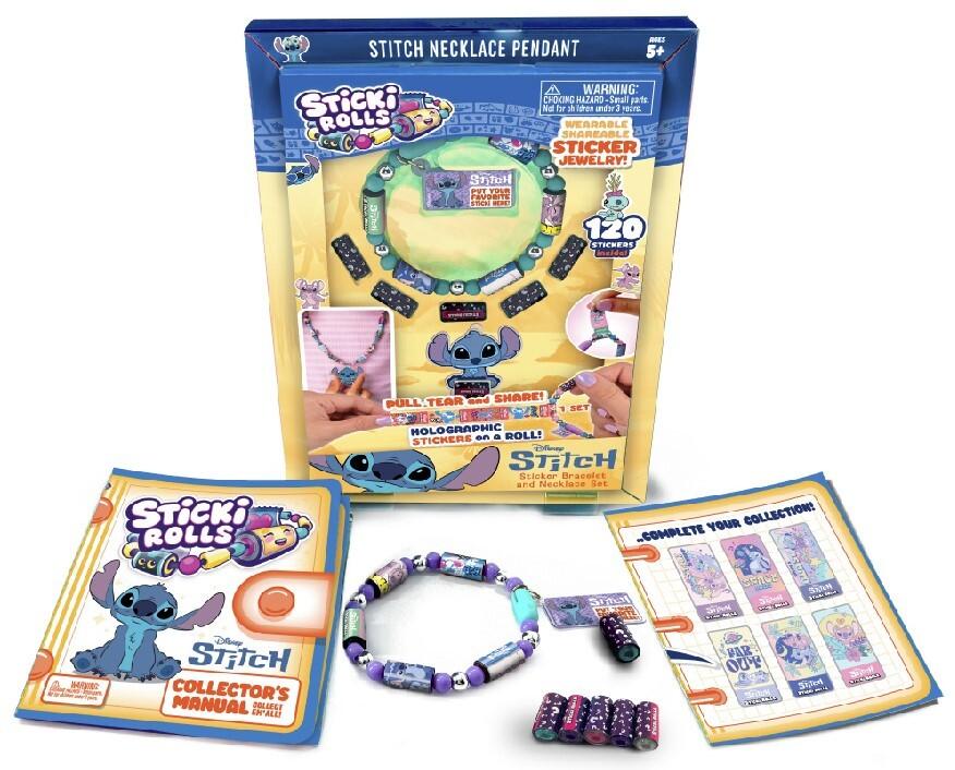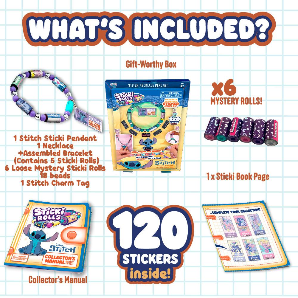 *Sticki Rolls: Stitch Pendant Set*Every single Sticki Roll on your bracelet is actually a roll of ten holographic mini stickers that you call pull, tear and share. With a total of 120 stickers in every pack, each with different cute, Kawaii stitch stickers.Find the super rare stickers with each pack including two extra mystery Sticki Rolls that are super or ultra rare. The whole collection includes over 1000 stickers to find and collect. Which ones will you get?*Features:** Toy bracelet* Brand: Sticki Rolls* Wearable toy* Pocket money toys* Ages: 5+*Suitable for Ages 5+*_WARNING: Choking Hazrard – small parts. Not suitable for children under 3 years._
