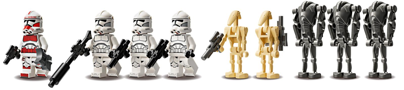 *Play out action-packed Clone Trooper vs. Battle Droid battles with a set featuring 4 LEGO® Star Wars™ Minifigures and 5 LEGO figures.*Inspire youngsters to recreate thrilling Star Wars: The Clone Wars scenes with this LEGO® Star Wars™ Clone Trooper & Battle Droid Battle Pack (75372) for ages 7 and up. It features 4 LEGO Star Wars minifigures and 5 LEGO figures – a Clone Shock Trooper, 3 Clone Troopers, 3 Super Battle Droids and 2 Battle Droids – with iconic weapons for action play. This LEGO building set also includes a stud-shooting Star Wars speeder bike for 2 Clone Troopers and a buildable STAP speeder vehicle toy for a Battle Droid. A tri-droid with 3 flick shooters and a defensive post with a stud shooter add even more creative play possibilities.Check out the LEGO Builder app for digital instructions and zoom and rotate viewing tools to enhance children’s building experience. This buildable playset is great to play with on its own and the characters and builds can be combined with other LEGO Star Wars sets (sold separately) in the extensive range.*Features:** Clone Trooper & Battle Droid Battle Pack for kids* Recreate Star Wars: The Clone Wars scenes with this buildable action toy* Featuring LEGO® figures, a speeder bike vehicle and more* 4 LEGO® Star Wars™ Minifigures and 5 LEGO figures for action play* A Clone Shock Trooper, 3 Clone Troopers, 3 Super Battle Droids* Plus 2 Battle Droids with assorted accessories* Buildable LEGO® Star Wars™ speeder bike* Speeder bike has 2 stud shooters, 2 holders for blasters and space for 2 Clone Troopers* A tri-droid with a rotating top and 3 flick shooters and a STAP speeder for a Battle Droid* A defensive post with a stud shooter, a thermal detonator element and more* Gift for Star Wars™ fans aged 7 and up* Give this fun, collectible building toy to kids who are into Star Wars: The Clone Wars* The tri-droid measures over 12 × 15 × 13 cm*Specifics:**Item:* 75372*Pieces:* 215*Ages:* 7+