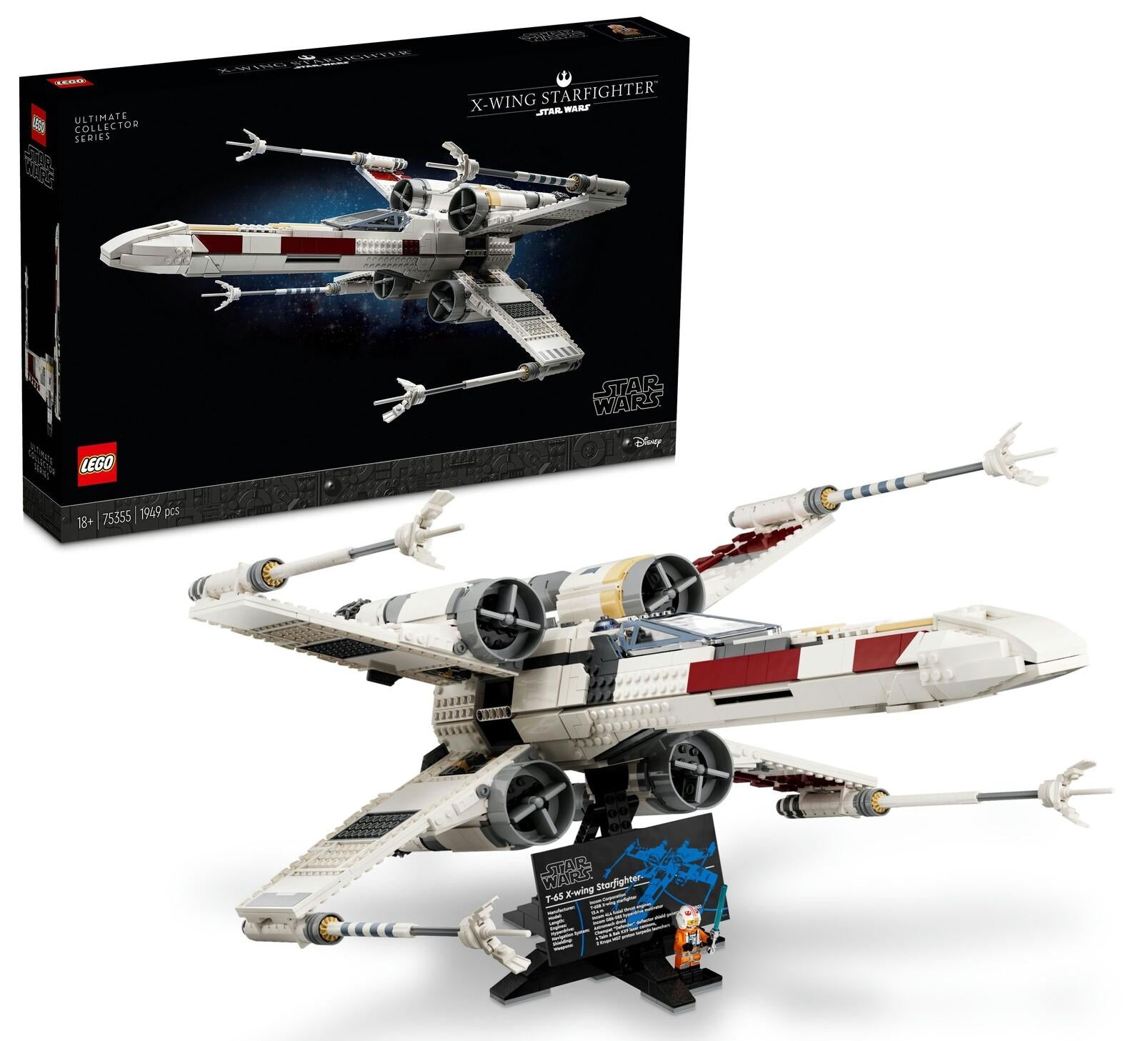 *The ultimate X-Wing Starfighter build-and-display model*Recall exciting scenes from the Star Wars trilogy and Star Wars: The Mandalorian as you build this stunningly detailed Ultimate Collector Series version of an X-Wing Starfighter (75355). Channel the focus of a Jedi to recreate authentic details using LEGO bricks, including the opening cockpit, space behind the cockpit for the R2-D2 LEGO droid figure, and wings that can be adjusted from flight mode into attack mode at the turn of a switch.Made for displayThe X-wing measures over 55 cm (21.5 in.) long and comes with a buildable display stand featuring a plaque showing X-wing technical data and space for the new-for-May-2023 Luke Skywalker LEGO minifigure with his lightsaber.LEGO BuilderThis collectible LEGO Star Wars set for adults makes a spectacular gift for yourself, another Star Wars fan or any advanced LEGO builder. Find illustrated instructions in the box and download the LEGO Builder app for 3D zoom and rotate tools and more to assist you with every step of this complex build.*Features:*\* Ultimate Collector Series X-Wing Starfighter build-and-display model\* Includes a Luke Skywalker LEGO minifigure and an R2-D2 LEGO droid figure\* Turn a switch to adjust the wings for flight and attack modes\* Display the X-wing and Luke Skywalker LEGO minifigure on the buildable stand\* Gift idea for Star Wars fans, advanced LEGO builders and UCS set collectors\* The X-wing measures over 55 cm (21.5 in.) long and is designed for display\* Zoom in and rotate the X-wing on screen as you build with the LEGO Builder app\* LEGO Star Wars Sets for Adults offer fun, mindful and creative activities\* Premium-quality LEGO bricks connect simply and securely*Specifics:**Item*: 75355*Pieces*: 1953*Ages*: 18+