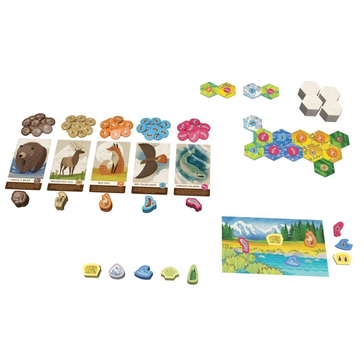 Match habitats and wildlife to build the most harmonious ecosystem!What will you see on your adventure in Cascadia? On your turn, build out your map and match animals and habitats to add sightings to your panorama and score points! Cascadia Junior lets younger players experience the spatial puzzle of the award-winning board game Cascadia. This standalone game teaches pattern building, set collection, and basic addition. Learn about bears, hawks, elk, salmon, and foxes in this diverse land of mountains, wetlands, prairies, rivers, and forests!In Cascadia Junior, players take turns drafting habitat tiles and adding them to their environment. They must try to match the same habitats to grow their habitat corridors and score more points while creating groups of three wildlife icons on connected tiles. Once they make matches, they earn wildlife and habitat sighting tokens that they can add to their panorama board, where they will make their own personal picture of the Cascadian wilderness! At the end of the game, all players flip over their sighting tokens to discover the conifer cones they have collected. The player with the most cones wins!Cascadia Junior is a stepping stone game that will allow children to learn the basics of pattern matching. Over time, they can use the included wildlife scoring cards with the advanced mode, which requires more complex shapes for each wildlife group. Once children gain familiarity with that mode, they can try out the family mode of the base Cascadia game and eventually the full Cascadia experience!*Features:** Players: 2–4* Playtime: 15–30 Minutes* Ages: 6+*Contents:** 50× Habitat Tiles* 30× Habitat Sighting Tokens* 30× Wildlife Sighting Tokens* 90× Wildlife Markers* 5× Wildlife Cards* 4× Panorama Boards* 1× Rulebook