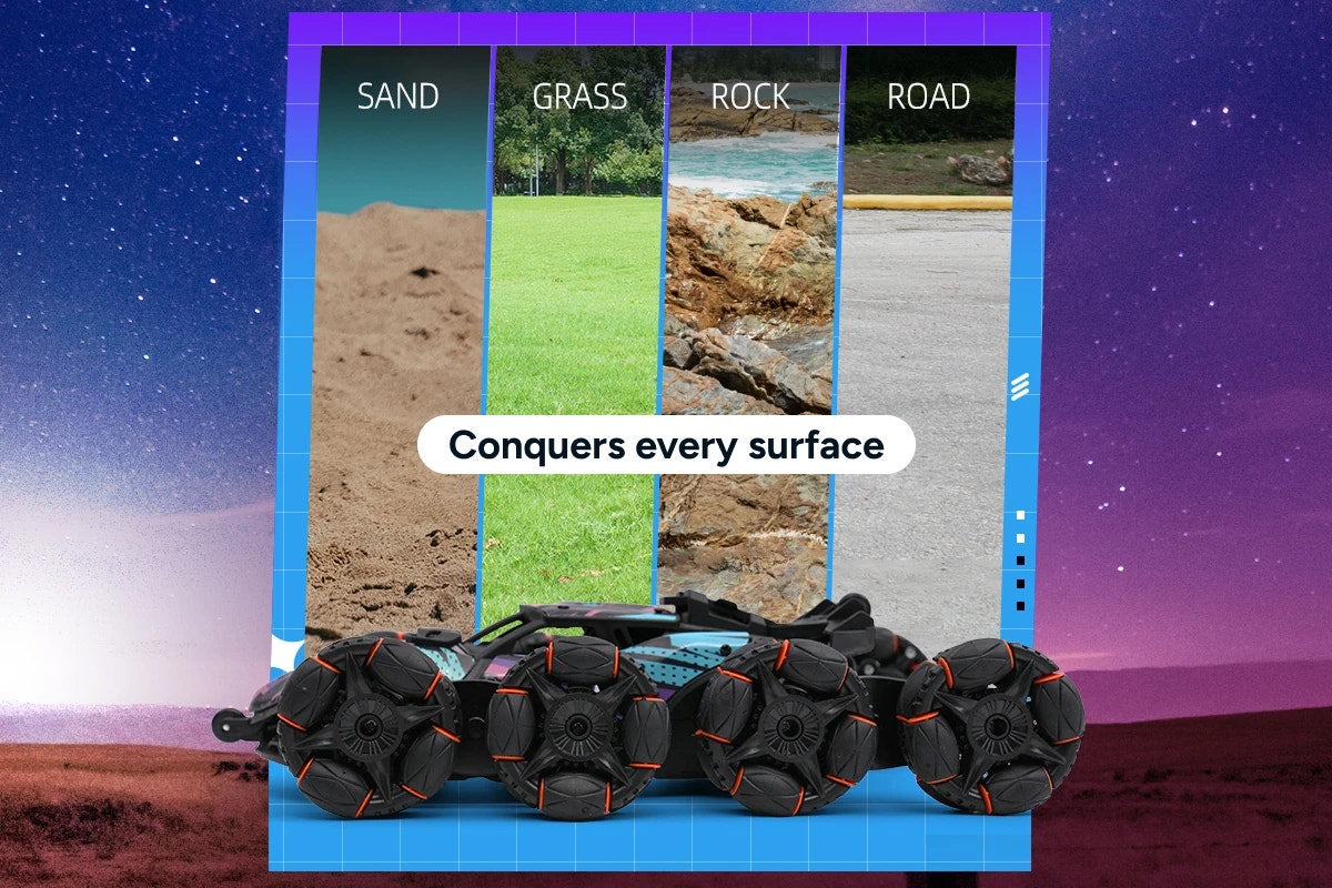 p{font-weight:bold;font-size:1.2em}. Unleash epic stunts, flashing lights and fog-like spray with the Kids 8WD Remote Control Stunt Car - packed with fun features and built tough for hours of off-road excitement.* *Tough alloy frame.* Built to handle rough play, bumps and drops with ease.* *Remote control driving.* Smooth handling in all directions for interactive play.* *Swing-arm suspension.* Conquers grass, sand, rocks and road with ease.* *Light and spray effects.* Misty spray and flashing lights bring the action to life.* *One-key demo mode.* Watch it perform a choreographed light, music and movement show.* *Music that moves.* Built-in sound effects add to the excitement.* *Suitable for ages 6+.* A great gift for kids who love fast, flashy action toys.p{font-weight:bold;font-size:1.2em}. Built for terrain and tricksFrom rocky trails to sandy patches, the eight independently-suspended wheels help the car glide over just about any surface. The clever swing-arm design flexes and shifts as it drives, giving it impressive grip and visual flair.