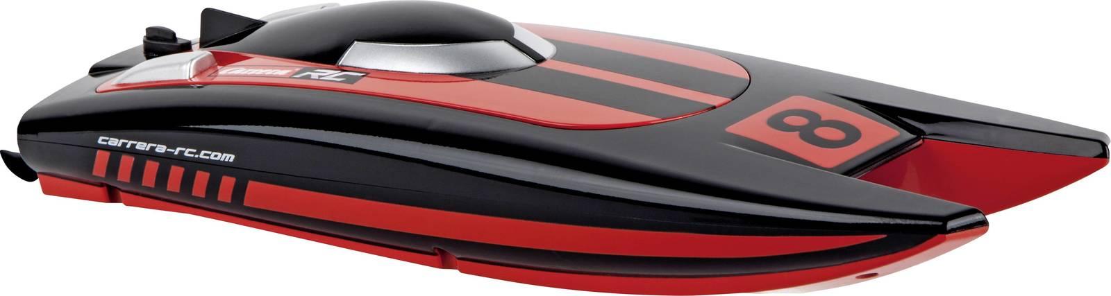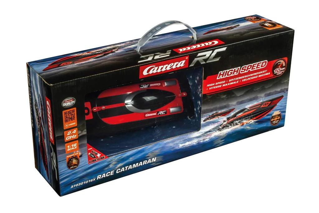 *The new Carrera RC Race Catamaran is perfect for fun on lakes or in pools!*This lively boat thrills with a stylish red-and-black racing livery and speeds of up to 10 km/h. This speedy 31cm racing boat soaks those in pursuit for up to 20 minutes before taking a short 50-minute break to recharge. The ergonomic control handset and Digital Proportional technology allow you to stay in complete control as you flash across the waves. The control set also guarantees extra signal range.*Specifics:** *Engine type* – Electric engine* *Scale* – 1:16.* *Length* – 31 cm.* *Battery technology* – LiFePo4 Lithium batteries* *Battery capacity* – 700 mAh* *Battery voltage* – 3.2 V*Suitable for ages 8 years and up*