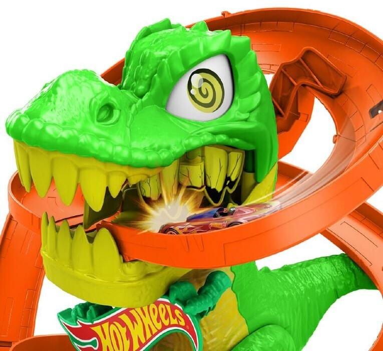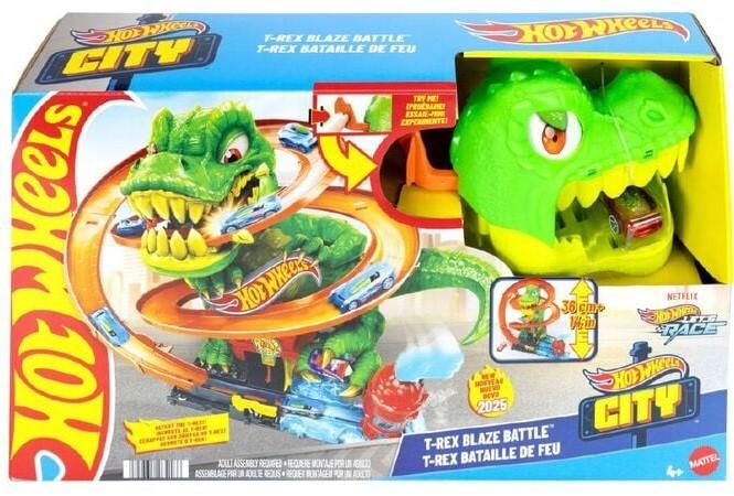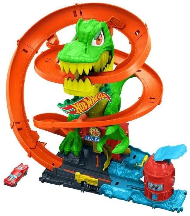 *Hot Wheels: City T-Rex Fire Station – Playset*Use epic racing skills to protect Hot Wheels City from a dynamic T-Rex that wants to eat all the cars! Kids launch the included 1:64 scale die-cast toy vehicle, and it zooms around the dino with three possible outcomes: get eaten and pooped out; hit a detour to refuel; or conquer the beast and save friends.Each time cars zoom past, the T-Rex's eyes spin and arms shake until it finally collapses! There's storage for additional cars and push-around play details for open-ended storytelling. Colours and decorations may vary.*Features:** Take on a hungry T-Rex that has attacked the Hot Wheels City fire station with a 1:64 scale toy car!* Playset features a large-scale dinosaur nemesis that has eyes that spin every time cars whizz past* Launch cars hard enough to spin the eyes and knock out the dino's teeth only to get eaten and then pooped out!* Reload and relaunch, but this time get detoured through the fuel station. Might as well fill up for the next run!* Don't quit now! With refuelling complete, launch again and get the K.O., saving friends and Hot Wheels City.* As they battle the nemesis, kids learn the importance of persistence and determination.* Kids 4 years old and up will love the challenge of defeating the dinosaur with their Hot Wheels vehicles!*Suitable for Ages 4+*