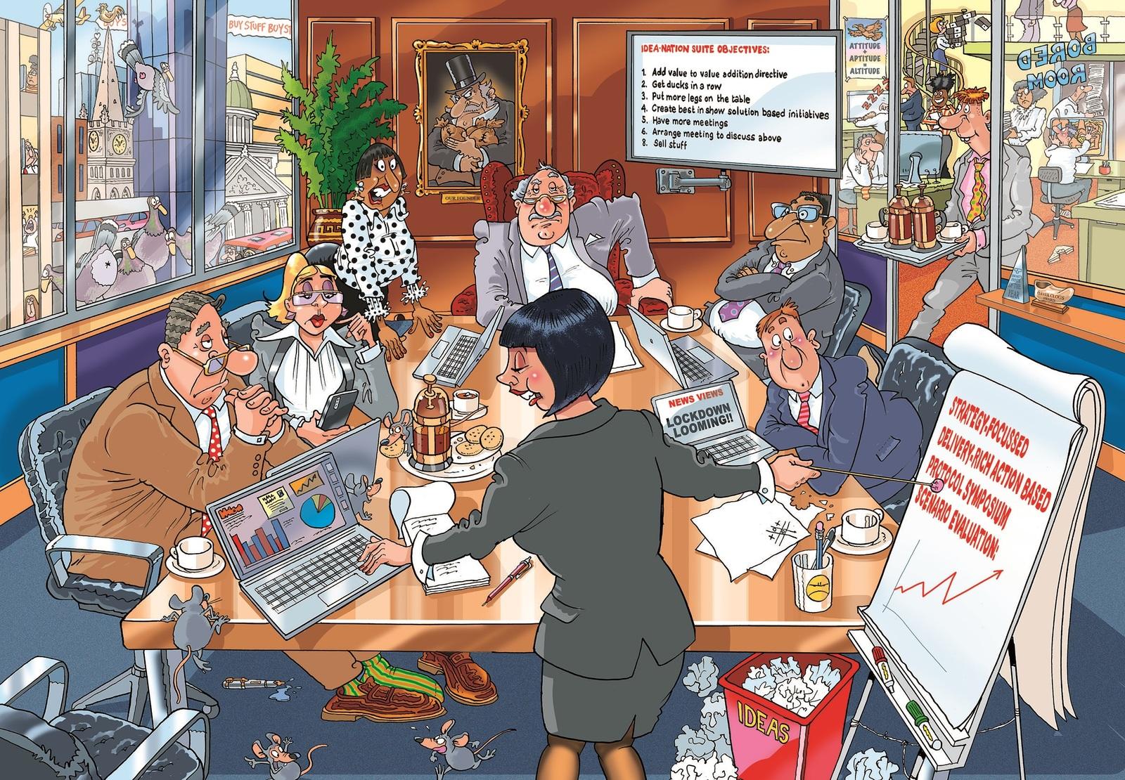 The high-pressure business world has long revolved around sleek, modern offices with the latest technology and smartly dressed staff with charts and figures at their fingertips. That is until 2020 turned working life on its head.The office of today might still rely on modern technology to keep business booming, but the employees may find their new surroundings a little more chaotic than before, with officemates that are less than cooperative come meeting time. Just how different does the post-2020 office really look? This is the scene you have to puzzle!Wasgij Destiny is the ‘time travelling’ puzzle concept where you have to use your imagination to piece together what the characters and the scene in the image printed on the box will look like in the future.Approximate puzzle size 688×493mm.Manufactured in New Zealand by Holdson.Suitable for ages 8+ years. "