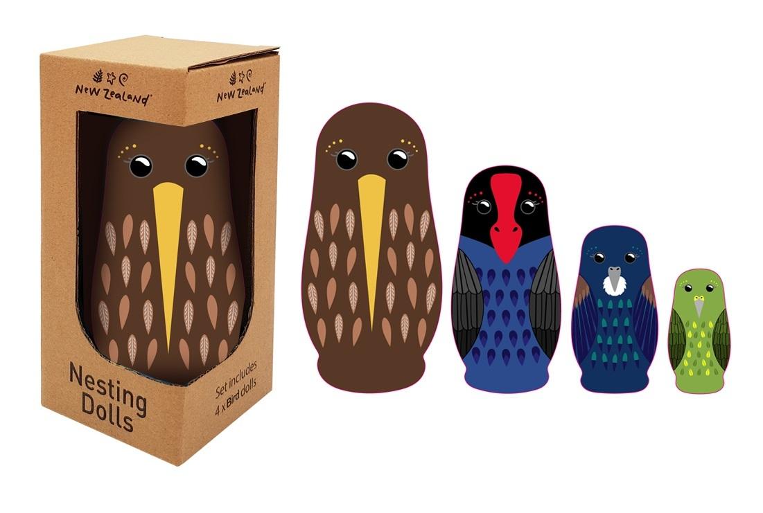 *New Zealand: Nesting Doll Set – NZ Birds*A Kiwi twist to the traditional nesting dolls. Stack them up or spread them up, it's all up to you! Put New Zealand's beautiful array of birds on display.*Features:** Includes 4 nesting ‘dolls’ (Kiwi, Pukeko, Tui, Kea).* Product Dimensions: 50mm – 145mm* Great as an early toy or gift!*Suitable for ages 4 & up*