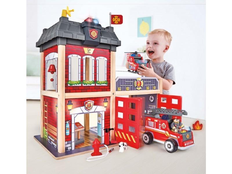 *Hape: Fire Station – Wooden Playset* Race to the rescue with this fabulous wooden Hape Fire Station Set packed with accessories and unique features. Ring the bell to alert the firefighter so that he can slide down the pole and into the fire engine. Press the button on top of the fire station and lights flash and an alarm sounds.The fire station set includes a fire engine, helicopter, firefighter, treadmill, dog, fire hydrant, fire extinguisher, axe and pretend fire. In fact everything youngsters need for exciting imaginative play!*Features:** Multi-level fire station, with fire engine, helicopter, firefighter figure and more!* Includes push-button fire bell and light. 2xAAA batteries required and not included* String mechanism puts the truck in motion and opens the garage door* Helps children to learn about fire safety*Suitable for ages 3 & up*