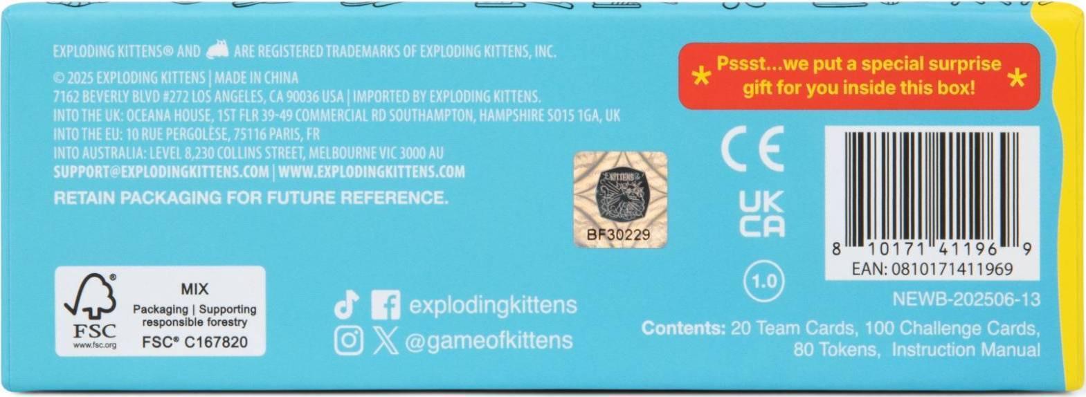 The loudest and most disloyal party game you'll ever play. This is a team game where everyone gets to do a challenge. Sounds easy, right?But, you don't know who's on your team until… you flip your team card! Now scramble to find your team and finish the challenge first to win! Teams change every round, winners have NO LOYALTY!*Contents:** 20 Team Cards* 100 Challenge Cards* 80 Tokens* Instruction Manual*Features:** 4–20+ Players* 15mins* Ages 7+