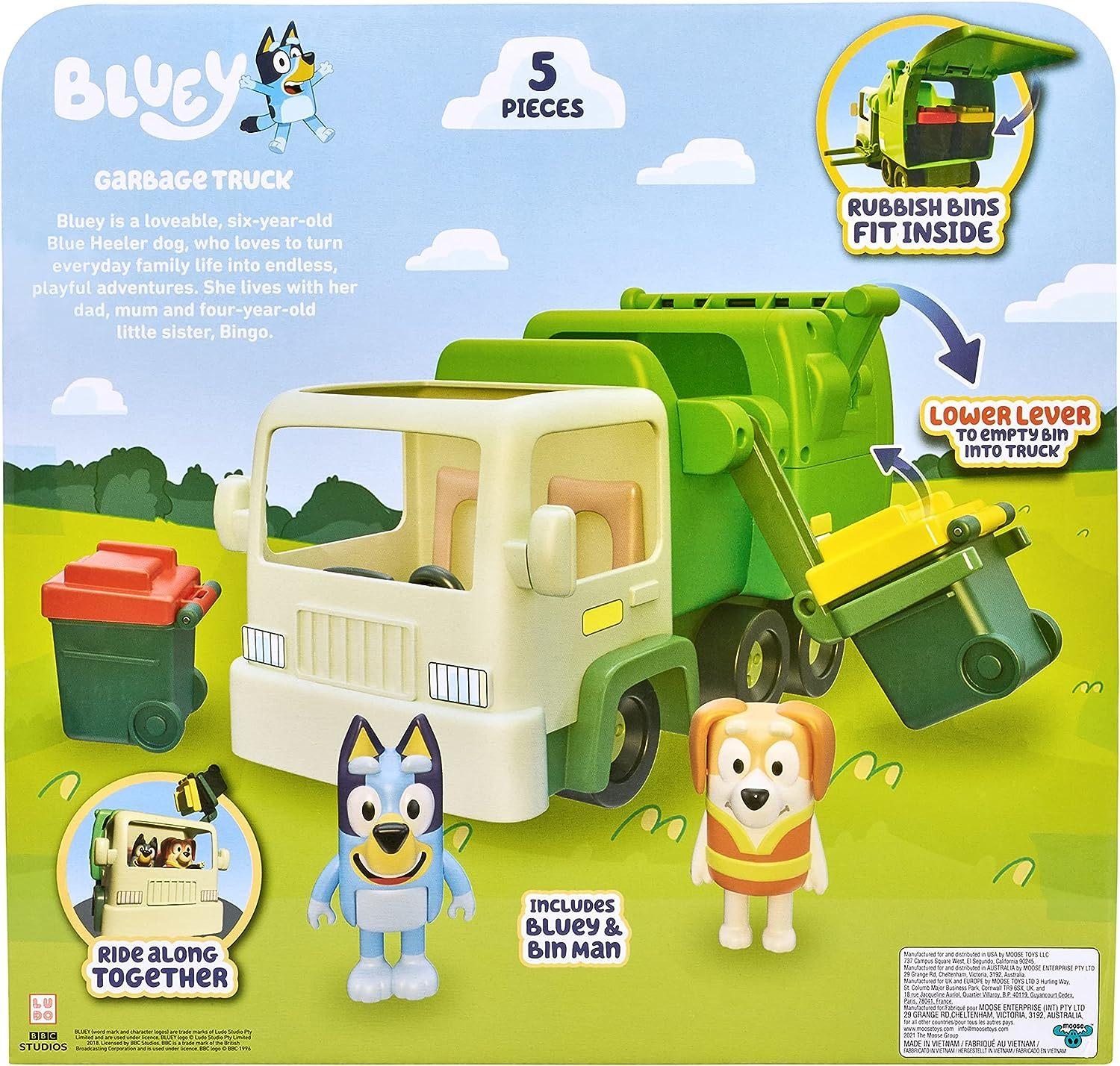 *It's Bin Night at Bluey's place!*Now you can help Bluey and the Bin Man collect the rubbish in his Garbage Truck. The Bluey Garbage Truck Playset comes with a 2.5" Figure of Bluey and the Bin Man. They are the perfect size to sit inside the Truck's cabin so they can ride along together.*Features:** There are also 2 Rubbish Bins. Drive the Rubbish Truck up to the Bins.* Then pull the lever on the side of the Truck to empty your bins into the truck!* After you have emptied the Bins you can lift up the back of the truck.* Both Bluey and the Bin Man are posable for fun play with articulated moving arms* They are just the right size for pre-school hands to move and play with.* Children will love to recreate some of the most memorable moments* What's Inside: 1 x Vehicle, 2 x Figure, 2 x Accessories*Suitable for ages 3 & up*