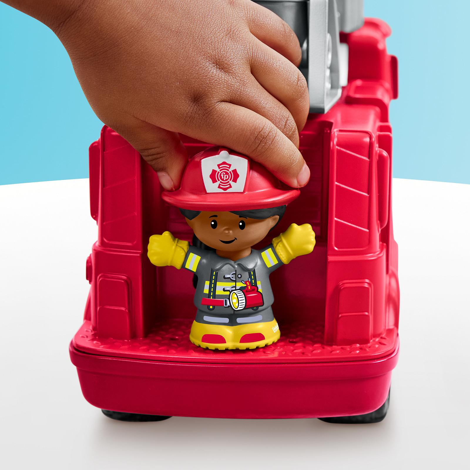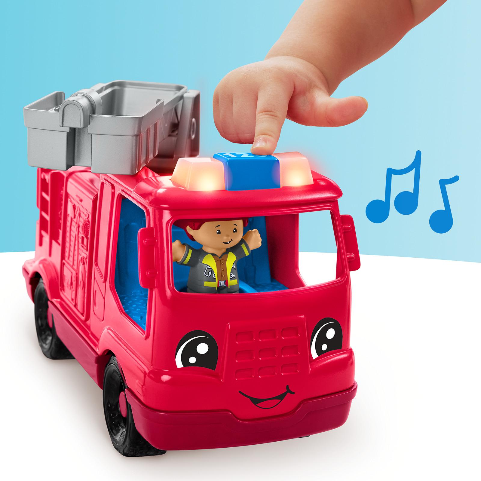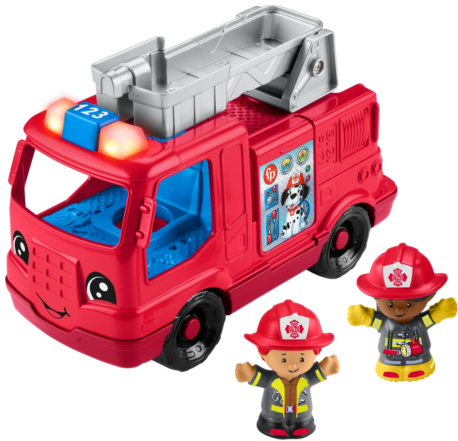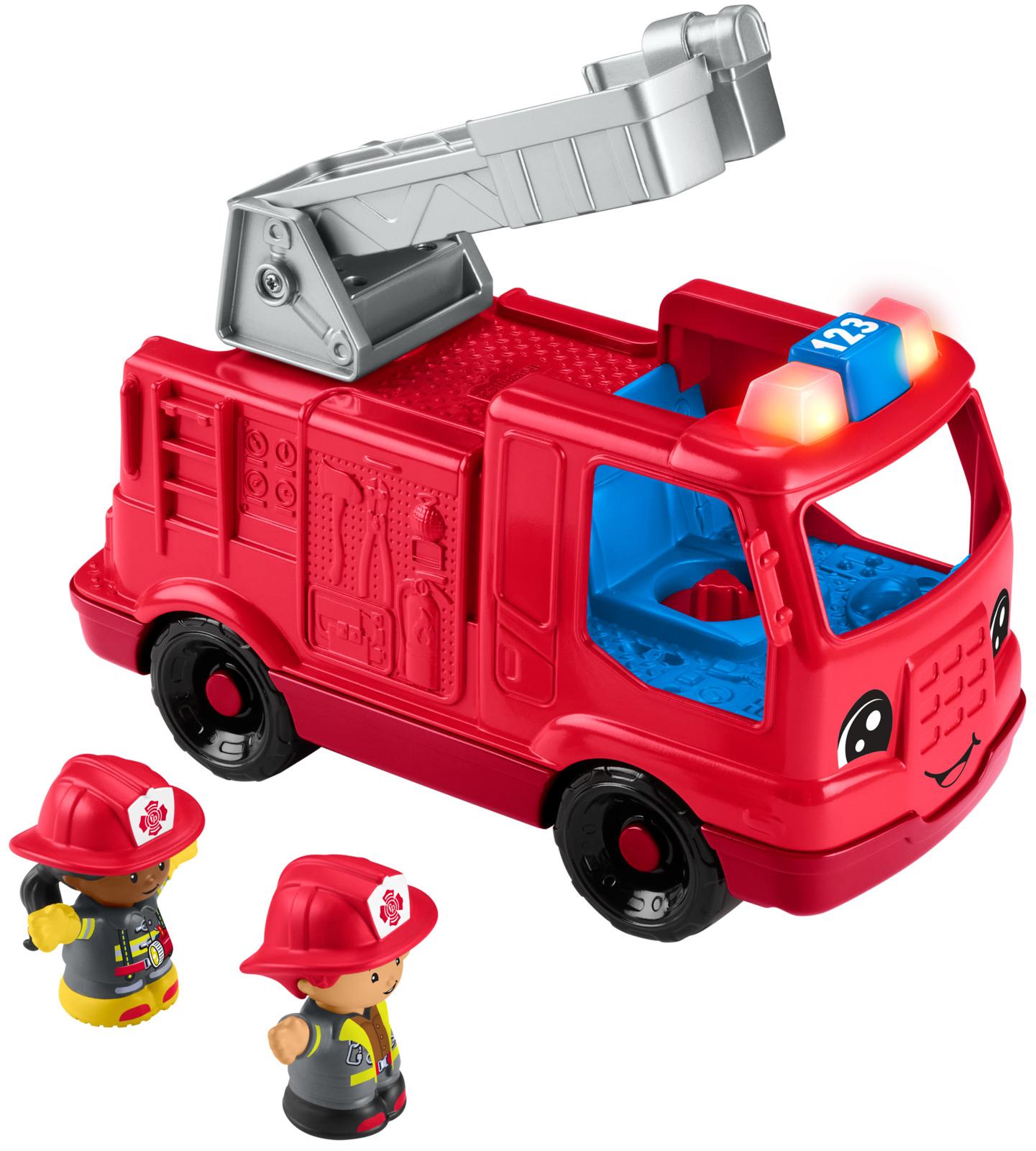 Toddlers can create their own fun rescue stories with the Little People® Fire Truck toy from Fisher-Price®. This push-along musical toy vehicle features fun lights, realistic sounds, sing-along songs and phrases, plus a ladder kids can lift and spin around as they play.*Features:** Features fun lights, realistic sounds, sing-along songs and phrases* Includes a ladder kids can lift and spin around as they play.* The Fire Truck comes with 2 firefighter figures that can ride along, one in the driver’s seat and one attached to the back of the vehicle, for storytelling fun.* Suitable for ages 1 – 5 years