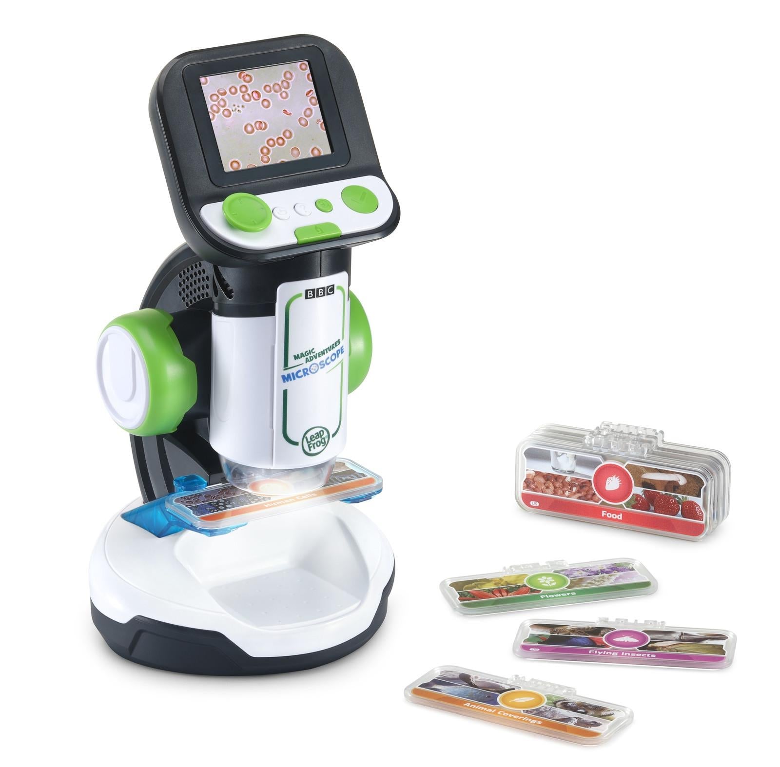 *Explore tiny worlds full of huge discoveries with the Magic Adventures Microscope by LeapFrog.*Young biologists can zoom in on flowers, animals, food, minerals and more using eight double-sided smart slides that activate amazing BBC videos and images. Discover answers to curious questions like: How do leaves changes colours? What do plant cells look like? What is sand made of anyway? Make your own discoveries by finding things around the house and getting a closer look using the reusable slides or large sample tray. You’ll be amazed what you can see with up to 200× magnification on this real microscope. See something incredible? Capture and save the on-screen images. Game time! Defend microorganisms from micro-invaders or put your skills to the test with the What’s This? quiz.*Features:** *Real Microscope* – Examine your collected samples with 50x-200× magnification.* *Viewing Screen* – 2.4" LCD viewing screen makes it easy to view smart slide content, play games and look at real samples.* *Smart Slides* – Clip the eight included smart slides under the microscope lens to see 220+ custom BBC videos and images.* *Fun Facts* – Scroll, zoom and focus on smart slide images to learn new things.* *Collect Your Own* – Find items around the house and place them on the two included reusable slides or sample tray.* *Capture and Share* – Save 100 pictures of your discoveries! Save thousands more by inserting an SD card (not included) in the SD card slot.* *Adventure Games* – Play four action-packed games to feed and heal microorganisms and defend them from micro-invaders across 24 exciting levels.* *Challenges* – Test your knowledge with the What’s This? quiz game._4 x AA Batteries Required_*Intended for ages 5+ years.*