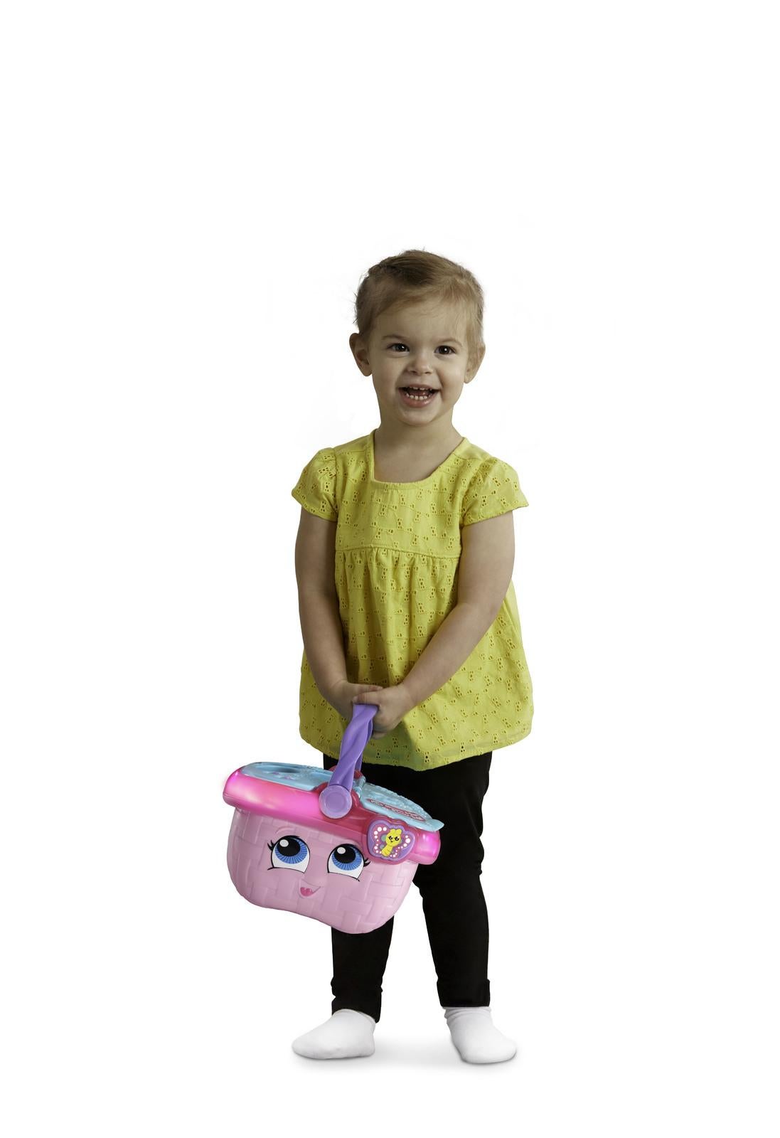 *Set a place for fun, learning and sharing!*Explore shapes, colours, manners and more with this 14-piece talking picnic set. Lift the basket lid to hear sweet instrumental music and fun sound effects. Fun and educational learning songs will have your child singing along and learning for hours. The Shapes & Sharing Picnic Basket encourages your child to independently play by reminding them to push the song button, lift the basket lid, sort and match the pretend food and more.*Features:** More than 30 audio responses encourage children to play pretend as they explore colors, shapes, sharing and more.* Children build motor skills as they sort, match, stack, empty and fill.* Includes two place settings for learning and sharing with a parent or friend.* Store everything you need right in the basket for easy clean-up every time!*Suitable for ages 6 – 36 months*