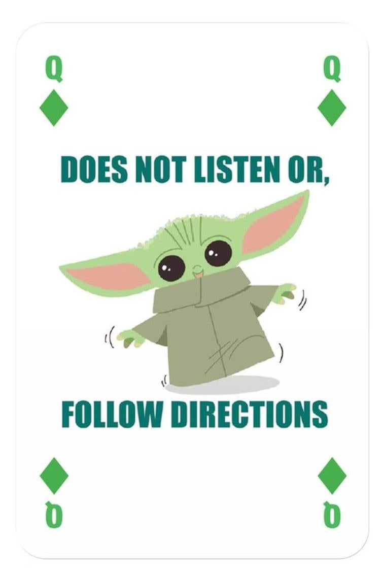 *“Here’s what I’m gonna do. I’m gonna walk to my ship, with the kid. And you’re gonna let it happen.”*Take a break from scouring the fringes of the galaxy and deal in your favourite mercs with this new edition of Waddingtons Number 1 Playing Cards starring “The Child” himself. This powerful youngling bears a striking resemblance to a certain Jedi master, but there’s no mind tricks that’ll give you the upper hand in any game of Poker, Rummy or Snap.The Aces, Kings, Queens, Jacks and Jokers in this pack are now sporting a selection of Baby Yoda memes, showing our hero Grogu in a variety of drawn poses and stills from the Disney+ series, The Mandalorian, accompanied by some snippets of wisdom.Whether you’re in a “napping mood” or “on the move”, there’s a card game to suit you, and what better way to play than with a toddler wise beyond his years?Perfect for everything from Blackjack to Solitaire, this pack features high-quality cards with official artwork guaranteed to please fans of the hit Star Wars series.Relive one of the most stunning television shows in recent memory while playing your favourite card games, whether for fun or for profit.*Key Features:** The Mandalorian fans can now play with this brand new bespoke Waddingtons Number 1 pack* Play your favourite card games with your favourite little green bounty!* 52 high-quality playing cards, plus 2 jokers* Hours of entertainment as you master much-loved card games from Poker to Bridge and Snap to Rummy*Specifications:** *_Product Dimensions:_* 60mm x90mm x20mm* *_Suitable Age:_* 4+* *_Number of Players:_* 2+