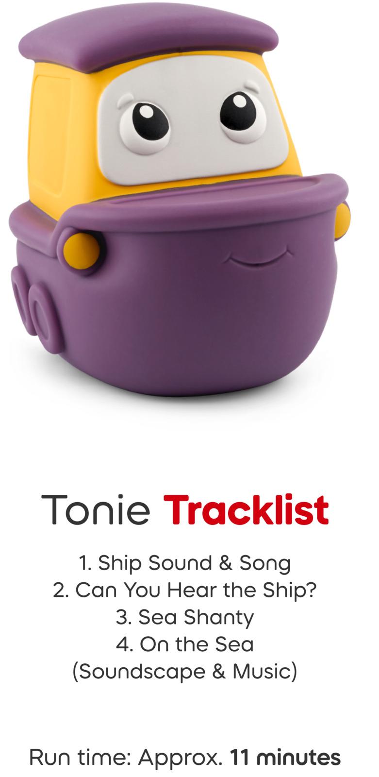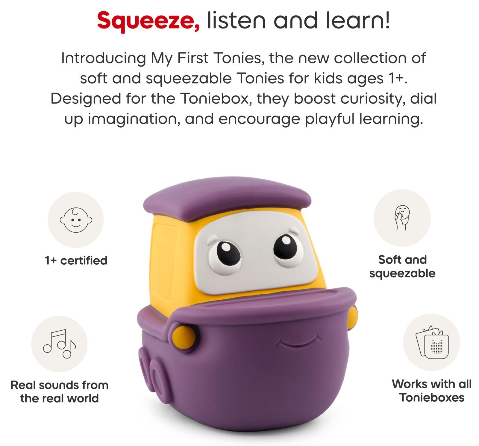 Listen, play, and learn about the wonderful world of vehicles! My First Tonies are soft and squeezable, perfect for 1–3-year-olds.Fly high in an airplane, plough through the waves on a ship or go on a journey by train! With short, lovingly told stories about airplanes, ships, and trains, they help build vocabulary, boost listening skills, and encourage early language development in a fun, engaging way.Discover a brand-new range of Tonies made just for little listeners aged 1 and up! Designed to support early learning through play, My First Tonies combine real animal sounds and playful language with short, simple stories. These catchy rhymes spark curiosity and imagination and help build vocabulary, boost listening skills, and encourage early language development in a fun, engaging way.Each My First Tonie features an original vehicle song, perfect for singing, dancing, and moving around, plus a mix of instrumental music and catchy melodies that invite open-ended play and create rich soundscapes and music that set the scene.*Features:** Sounds and songs for the big first words: Support little ones as they start learning about their favorite topics with age-appropriate, screen-free fun.* Real sounds from the real world: Boost kids’ curiosity about the world around them with real audio, from the roar of a plane engine to that of a tiger.* Soft and squeezable design for tiny hands: From the squishy and soft texture to the larger yet lightweight size, My First Tonies are specifically created for kids 1+ to safely handle all on their own.* Easy to clean: When it comes to little kids we know things get big-time sticky. That’s why my \* First Tonies are designed for easy cleaning. Wet a cloth with just a touch of dish soap and water, wipe down, and get ready for more play.* Total run time: 36 minutes*Track List:** Airplane Sound & Song
