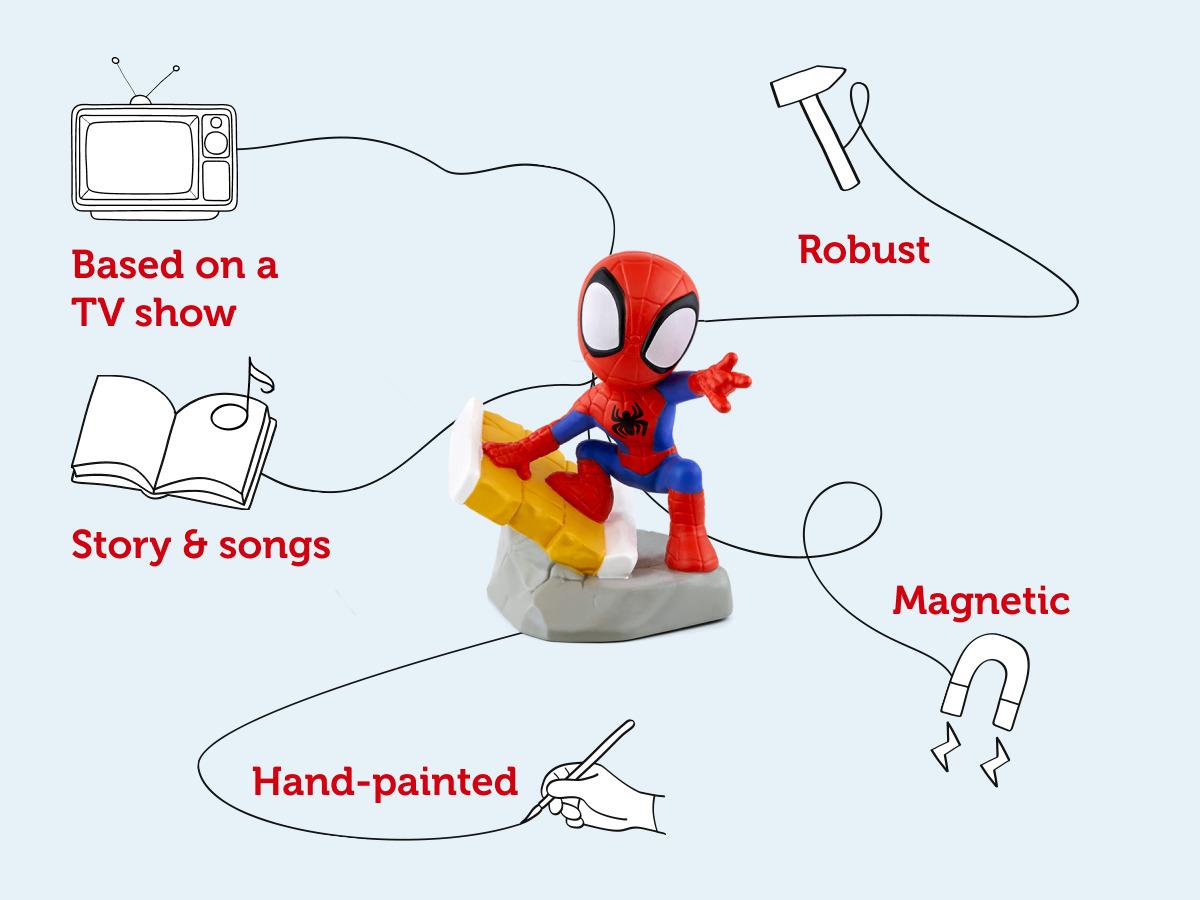 *Tonies – a new audio experience designed for little listeners!*Go Webs Go! Keep your little Spidey fans from crawling the walls with this set of spideriffic stories, from Marvel’s Spidey & His Amazing Friends.Know a Spidey fan who loves a story? Keep them from crawling the walls with this set of amazing adventures, featuring Spiderman and his equally amazing friends, Miles Morales and Ghost-Spider. Oh, and a few less welcome visitors, of course (Green Goblin, we’re looking at you.). Whether it’s play time, bed time or travel time, for Spidey fans it’s always web time – so when your little spider is ready to be spun a yarn, let them just pop Spiderman on top of a Toniebox and they’ll soon be caught up in a web of stories. Featuring a selection of tales from Marvel’s Spidey & His Amazing Friends, this Tonie is great for even the littlest Spidey ears. Go Webs Go!Tonies are characters that feature content, stories and songs from an ever-growing collection of modern favourites and timeless classics. Swapping stories is as simple as changing the Tonie on your Toniebox. Each Tonie is unique and includes its own selection of child-friendly content. (Artists performing tonies songs and stories may differ from those performing original licensed content.)*Specifics:** *Recommended Age* – 3+* *Running Time* – approx. 40 minutes* *Features* – Magnetic, hand-painted* *Contents* – 1× Tonie* *Material* – Plastic*Tracklist:*1. Marvel’s Spidey and His Amazing Friends Theme Song2. Webs Up Song3. Super Hero Song4. *tonies Story:* Spidey and His Amazing Friends – Too Much Fun